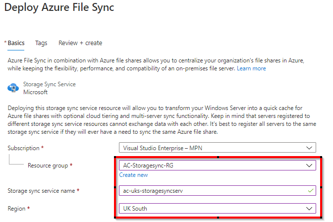 Click create, and add the resource group, stroage sync service name and region, add any tags and create: