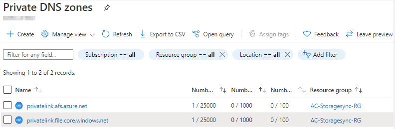 Before moving to the server endpoints we have two last steps, first is to obtain the FQDN and IP address for the storage endpoint and each of the Storage Sync Service services. The best place to get these is to Private DNS Zones: