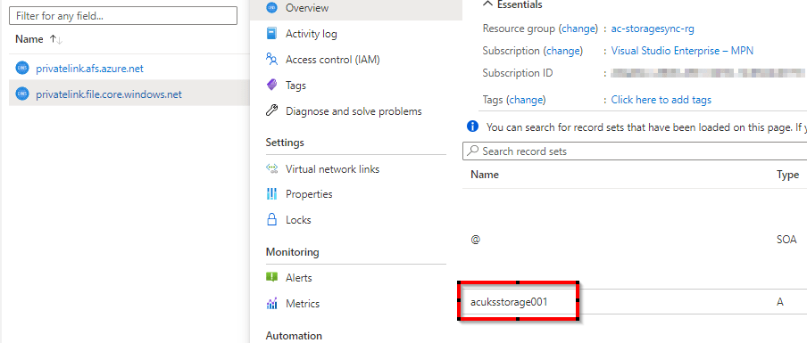 - ac-uks-storagesyncservmonitoring.uksouth.privatelink.afs.azure.net 10.0.1.8