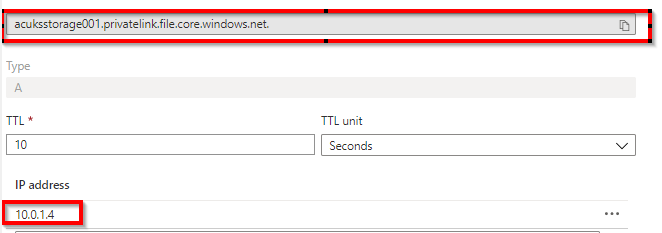 - acuksstorage001.privatelink.file.core.windows.net 10.0.1.4