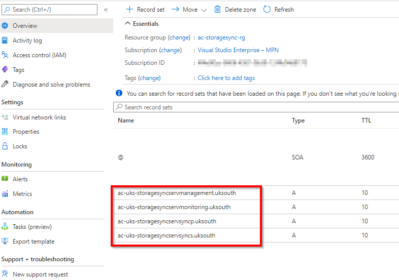 - ac-uks-storagesyncservsyncs.uksouth.privatelink.afs.azure.net 10.0.1.7