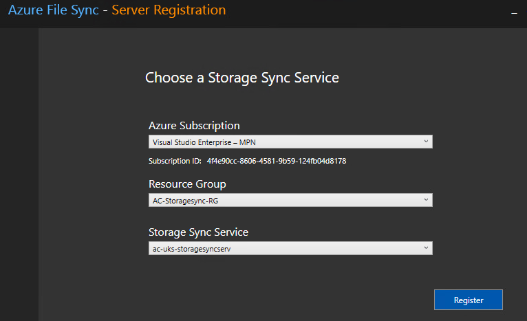 Select the Azure Subscription, Resource Group and Storage Sync Service created previously.