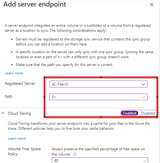 Add the registered server, share path and cloud tiering requirements.