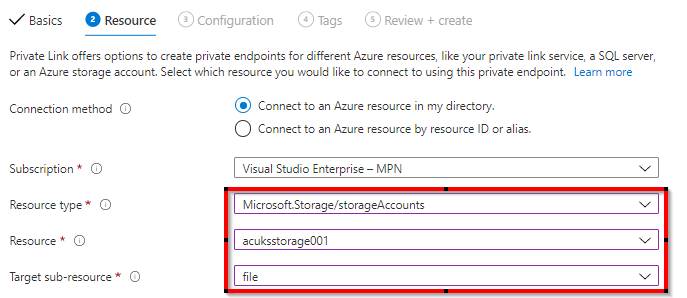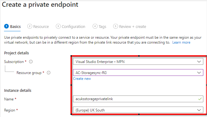 We will be adding 2 Private endpoints, one for the storage account and one for the storage sync service. For the first you add the resource group, name and region.