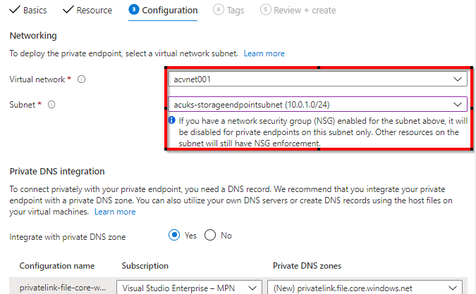 On te configuration page, select the VNet and subnet which will contain the Private Endpoint IP addresses.